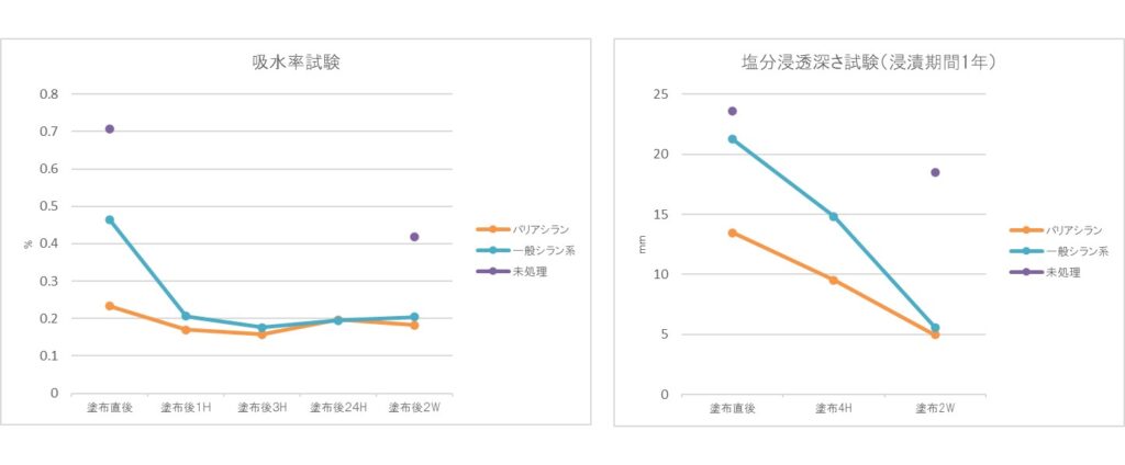 塗布後の養生時間をパラメータとし、それぞれ吸水率試験(7日間)、塩分浸透深さ試験(NaCl10%、1年間浸漬)を実施した結果、塗布直後より早期の吸水抑止効果および遮塩性能を確認しました。(試験機関:東洋大学理工学部福手研究室)